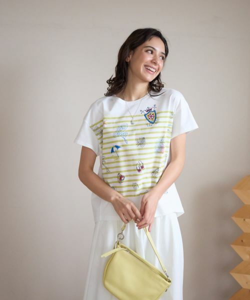爽やかなボーダー柄に、夏のモチーフを散りばめた遊び心あふれるプリントTシャツ。やや薄手の柔らかな素材は伸縮性があり、暑い季節も快適な着心地に。程よくゆったりとしたシルエットが身体のラインを拾いにくく、リラックス感のある印象を演出します。長すぎず短すぎない丈感で、パンツにもスカートにも好相性。ウォッシャブル仕様で、毎日の装いに気軽に取り入れられます。------------------------------------着用シーズン:夏 伸縮性:あり透け感:ありポケット:なし生地の厚さ:やや薄手お取扱い方法:ウォッシャブル(手洗い可)-------------------------------------※商品の色味は、撮影場所や光のあたり具合、お客様のお使いの機器により色味が違って見える場合がございます。予めご了承ください。※定価(税込)は、2025年6月27日のセール開始前の店舗における販売価格です。手洗い可酸素系漂白可タンブル乾燥不可つり干し(日陰)アイロン低温210℃までドライクリーニング不可ウェットクリーニング(弱い処理)