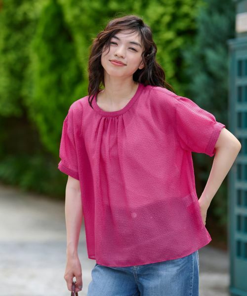 凹凸感のあるポリエステル素材で、肌離れのよいドライな着心地を叶えたブラウス。見た目も風合いも涼やかな、これからの季節に嬉しい一枚です。フロントは控えめなギャザーでやわらかく立体感を作り、バックネックはループボタンでさっと開閉できる仕様に。袖はゆったりとボリューム感をもたせ、裾にはサイドスリットを入れて、さりげなく動きのあるシルエットを演出します。オンにもオフにも使いやすい、きちんと感と軽やかさを両立した大人のためのトップスです。