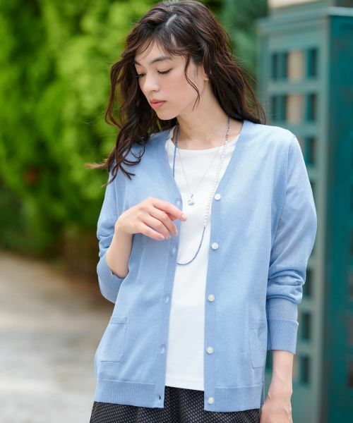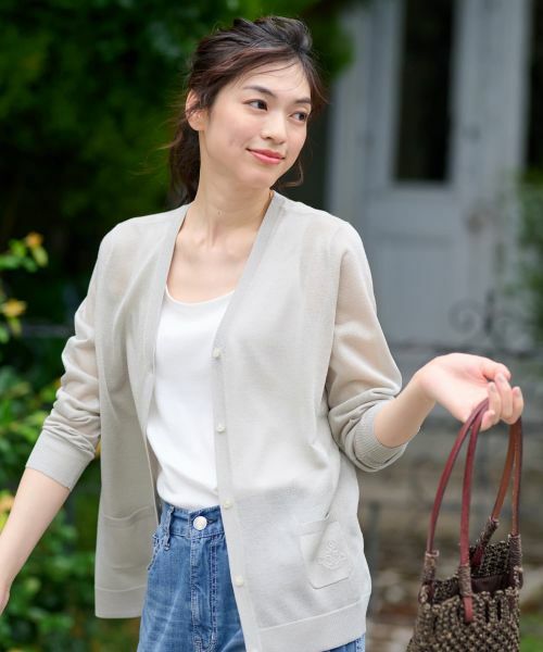 全体に散りばめられた細やかなラメがほんのりと光をとらえ、羽織るだけで着こなしにニュアンスを添えるVネックカーディガン。レーヨン×ポリエステルのハイゲージ編みが生む、なめらかな肌触りと上品な艶感も特徴。左ポケットにはアンカー刺繍が施され、リラックスした中にユニークなアクセントを添えています。軽やかさと華やかさを兼ね備えた、ロングシーズン活躍してくれそうな心強いトップスです。