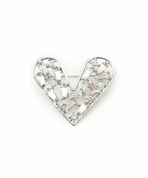 フレームの内側に大小のきらめくストーン調パーツをたっぷりとあしらった、スイートなデザインに心惹かれるハート型ブローチ。旅先でのシンプルな編み地のトップスやジャケットに添えるだけで、エレガントな雰囲気が引き立ち、特別な時間を演出します。
