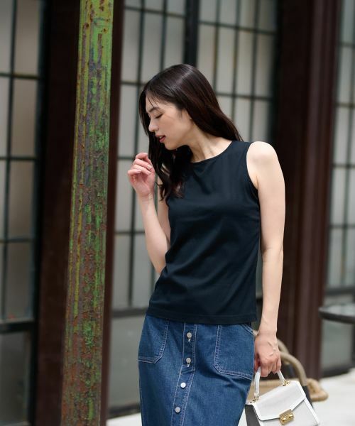 柔らかく上質なコットン素材で仕立てられた、これからの季節のきれいめカジュアルにぴったりのタンクトップ。肌に優しく馴染み、快適な着心地が魅力です。フロントネック下に施されたさりげない同色ロゴ刺繍が、シンプルながらも上品なアクセントに。詰まりすぎず開きすぎない絶妙なネックラインと、程よく身体にフィットする美しいシルエットで、一枚でもインナーとしても品良く決まります。
