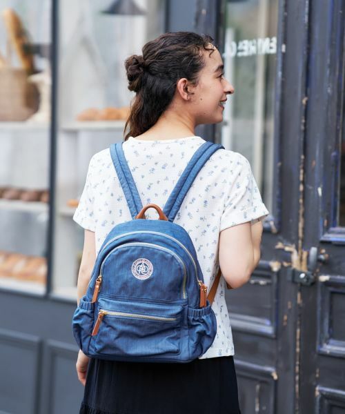 爽やかなデニム風のカジュアルな素材感が魅力のバックパック。外側に5つ、内側に1つのポケットを配し、荷物の整理がしやすく収納力も抜群です。中央に施されたサークル形状のロゴ刺繍がユニークなアクセントに。ゴールドのファスナーやブラウンのパーツが上品なアクセントをプラス。軽量で普段使いに最適なデザインと実用性を両立したアイテムは、マザーズバッグとしても活躍します。