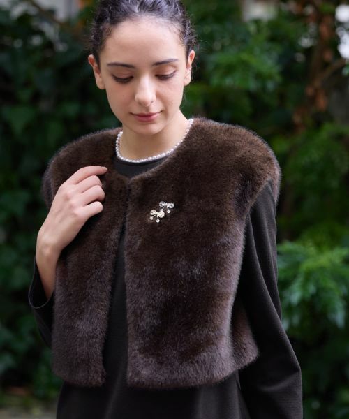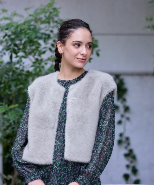 上品な艶めきと、柔らかな差し毛の風合いが魅力的なフェイクファーベストです。リッチな素材感が、大人の女性にふさわしい一枚。すっきりとコンパクトなサイズ感は、パンツスタイルからスカートスタイルまで、どんなボトムスとも好相性です。いつものコーディネートにさっと羽織るだけで、トレンド感あふれる旬のスタイリングが完成し、装いに華やかなアクセントを添えてくれます。旅先でのワンマイルコーディネートや、ちょっとしたお出かけにも、心躍るおしゃれをお楽しみいただけるアイテムです。