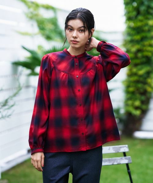 ふんわりとしたオンブレチェック柄が、これからの季節の装いにニュアンスを添えるバンドカラーブラウス。襟元とカフスにあしらわれた、ウェーブ状のコードテープがデザインのポイント。さらに胸元のヨーク切り替えから生まれる柔らかなギャザーがフェミニンなムードを演出。やや薄手の軽やかな生地感で季節の変わり目に活躍間違いなしの一枚。色によってはやや透け感があるため、インナーとのレイヤードを楽しむのもおすすめです。