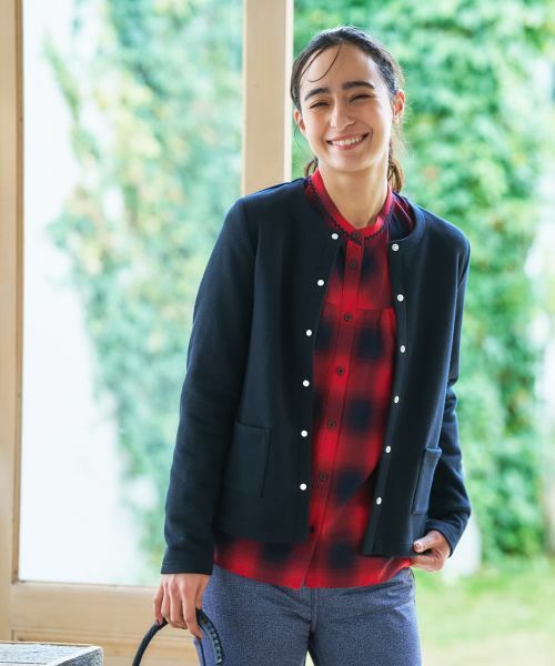 カジュアルなスウェット素材に繊細なラメを織り込んだハオリ。顔周りをすっきりと見せるノーカラーデザインで、フロントは着脱しやすいスナップボタン仕様。伸縮性のあるやや厚手のスウェット生地なので軽い羽織りとして快適な着心地を実現します。便利なパッチポケット付きで、さりげないロゴ刺繍がアクセントに。これからの季節のデイリースタイルでフレキシブルに活躍する一枚です。
