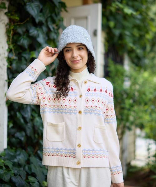 温かみのあるノルディック柄が目を惹く、冬の装いを華やかに彩るカーディガン。
