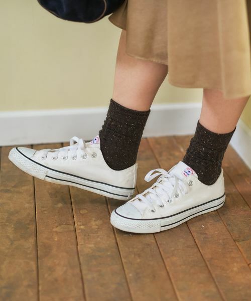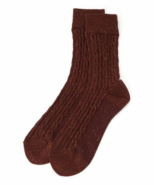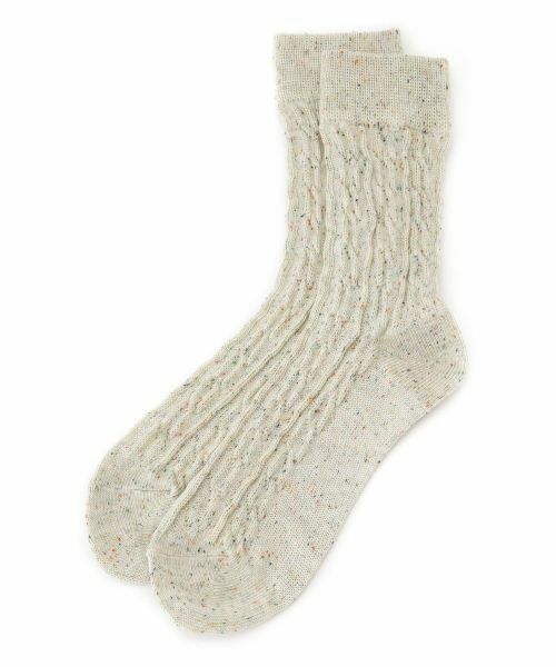 カラフルなネップがちりばめられた糸を使用して丁寧に編み込んだ、表情豊かなソックス。足元に温かみと季節感をプラスする、立体的なケーブル編みがデザインのポイント。伸ばして履いても、足首でくしゅっとさせても様になる長さで、パンプスやローファー、ショートブーツの履き口から覗かせるコーディネートに最適。これからの季節の様々なシーンでのスタイリングに彩りを添えるアイテムです。