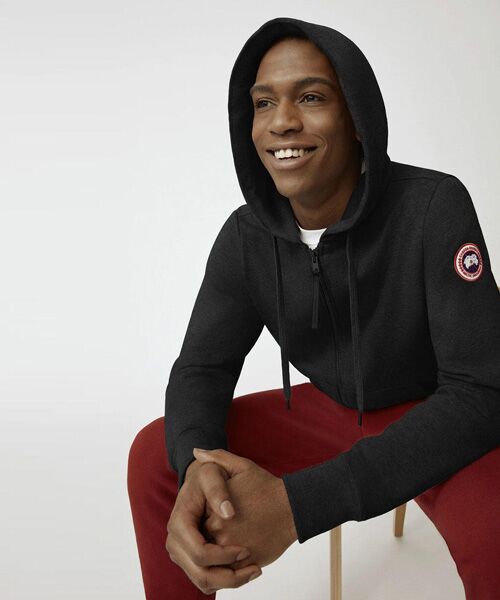 <ヒューロン フルジップ フーディー>は高品質のコットンを使用し、調節可能なドローコード付きフードが顔を覆い、外気から守ります。