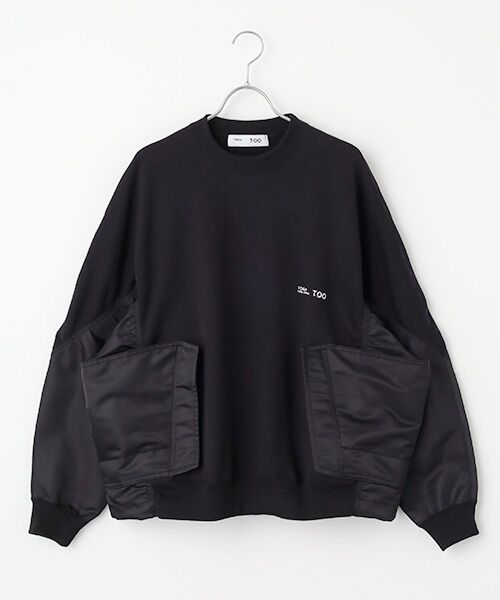 TOGA TOO(トーガトゥー)'25AW COLLECTION。スウェットとナイロン生地のドッキングによるスウェットです。サイド部分がポケットになっており、フラップをめくるとフロントにもポケット付き。後見ごろの裾のドローコードで絞って身幅の調節が可能。胸にブランドロゴの刺繍が入ったユニセックスなアイテムです。