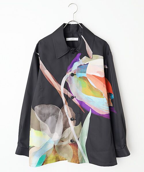 「チューリップ」と「スイセン」をモチーフにした、抽象的ながらも大胆な花柄のシャツジャケットです。共に冬から春の寒い時期に花をつけるため、強くたくましく成長する姿を表現している柄です。大胆な柄に装飾を削ぎ落としたミニマルなデザインのシャツジャケットはUJOHらしい一品です。
