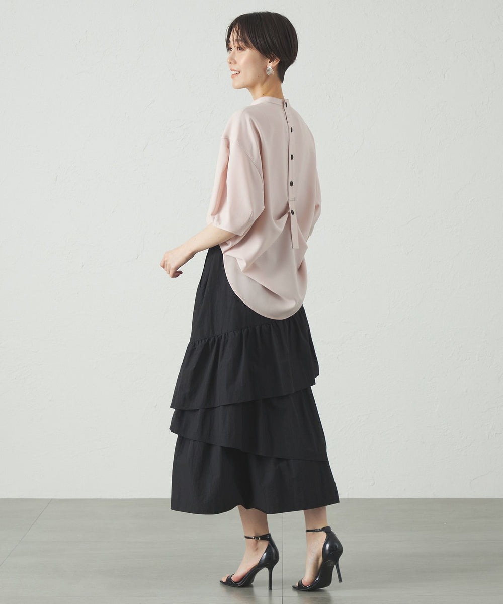 ブランド定番のバックボタンデザインが目を引く半袖ブラウス。 タックの入ったフォルム感のある袖と、少し体から離れたシルエットで、夏も涼しく着用して頂けます。 胸元に入った配色ステッチが効いているので、ジャケットやカーディガンを羽織った時もインナーの存在が際立ちます。