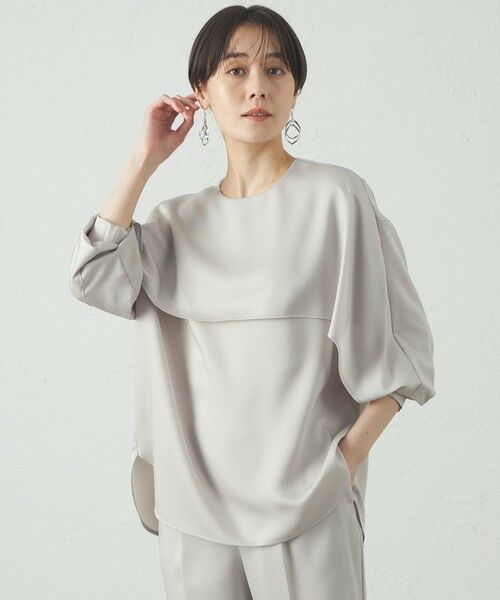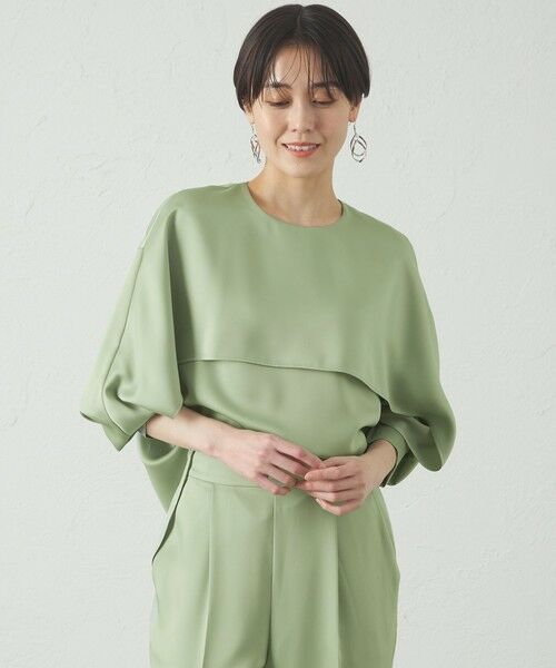【CAST:キャストコロン 2025年春夏アイテム】【Design】レイヤードケープディテールが目をひくデザインブラウス。1枚でもサマになり、ジャケットを羽織っても前にデザインが入っているのでインナーブラウスとしても活躍します。袖にはニットリブを付けているので、袖を上げてもきちんと留まります。デザイン性と機能性に優れたブラウスです。【Fabric】シルクのような上質な肌触りと、ほどよい光沢感が特徴的なサテン生地を使用しています。優しい光沢感が魅力です。【Styling】キレイめなシーンにもデイリーシーンにも使いやすいブラウス。同素材のパンツ(N5R93-525)との合わせをお勧めします。●洗濯:手洗い可透け感:なし伸縮性:あり生地の厚さ:普通おすすめ着用期間:春、夏、秋※この商品はサンプルでの撮影を行っています。実際の商品とイメージ、サイズ、品質表示、原産国等が異なる場合がございます。※店頭及び屋外での撮影画像は、光の当たり具合で色味が違って見える場合があります。商品の色味は、スタジオ撮影の画像をご参照ください。