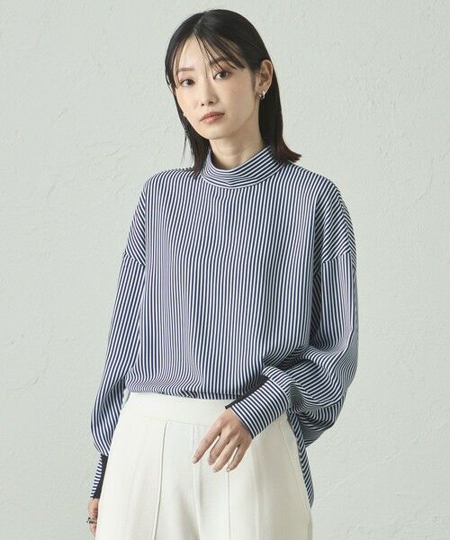 プリントしたストライプ柄を使用した、バックボタンディティールがCAST:らしいデザインブラウス。