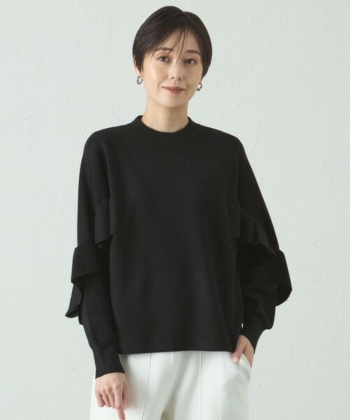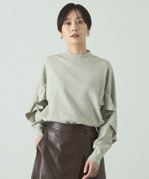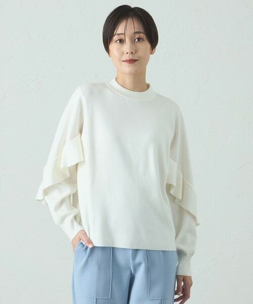 身頃から袖部分にかけてのフリルディテールが特徴のデザインニット。フリルを低めの位置にすることで、甘くなり過ぎないボリュームにしました。1枚でサマになるデザインニットです。