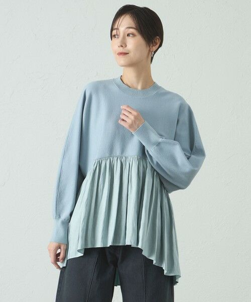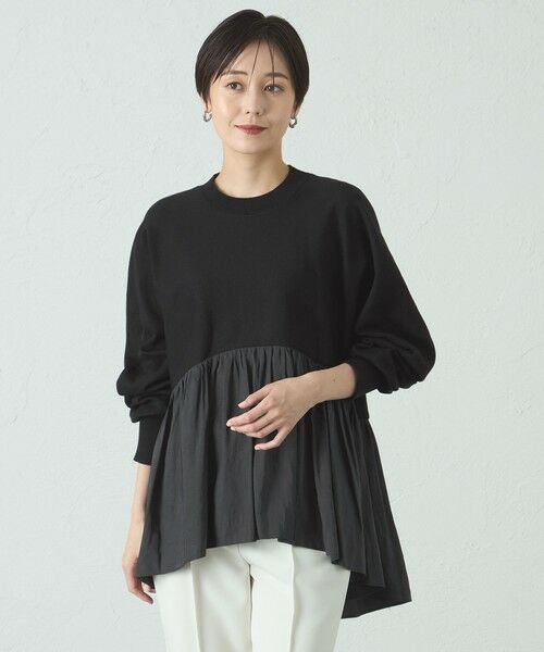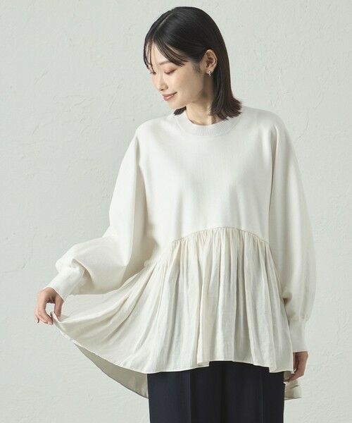 ハリのあるニットと、ヴィンテージ調の素材をコンビさせたチュニックトップス。