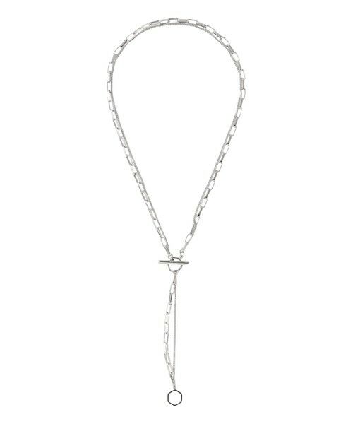 形の異なるチェーンを二連にしたネックレス。重ね付けをしているように見えるデザインにしています。留め位置が二か所あるので、長さを変えてご使用いただけます。マンテル部分の位置を前後どちらに持ってきてもスタイルが決まるネックレスです。