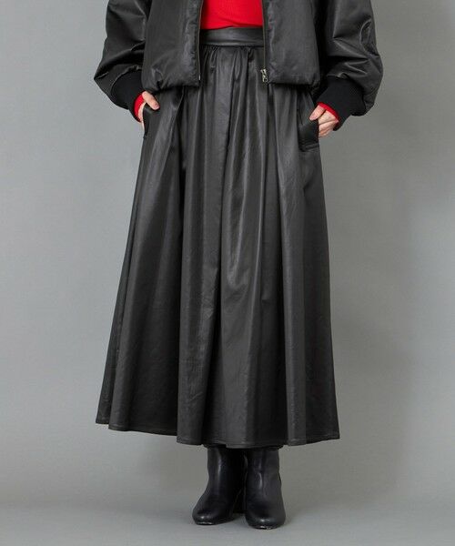 レザー調のサテン素材を使用した、タックとギャザーを合わせたフレアスカート。贅沢なボリューム感が特徴です。