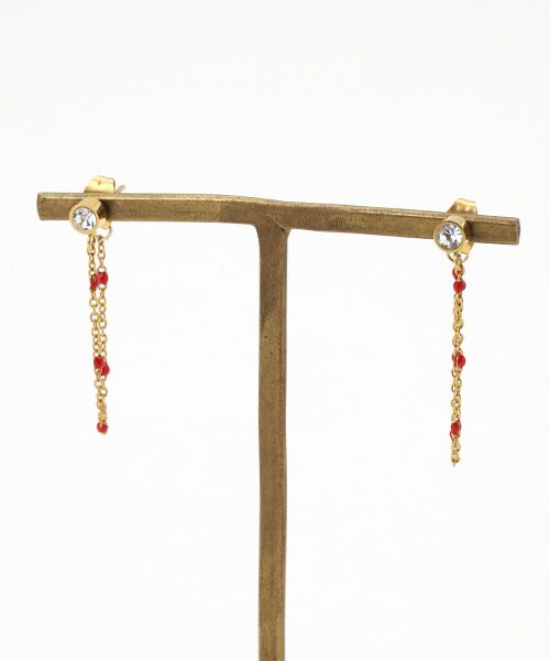 キャッチが本体のチェーンに繋がったデザインのため、キャッチだけなくなるという心配がありません。上部のスタッズ部分がさりげなくきらめき、チェーン部分では優しい揺れ感をお楽しみいただけます。さりげないレッドカラーのストーンがなんとも愛らしいステンレス製ピアスです。