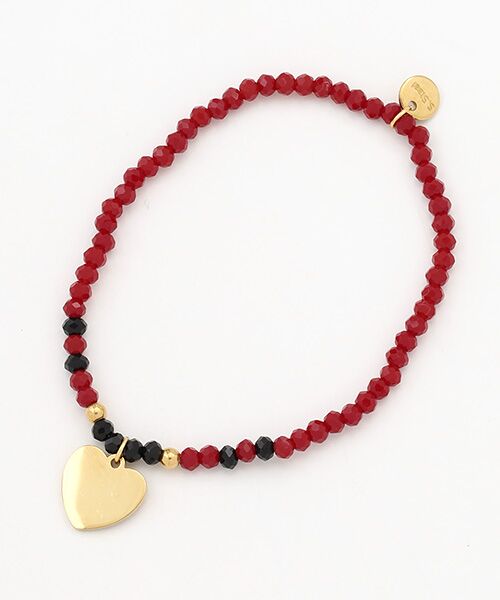 サッと着けられるのが魅力のゴムブレス。シックなレッドをメインに少量のブラックのストーンがアクセントに。ステンレス製のハートモチーフメタルが優しい印象を醸し出します。