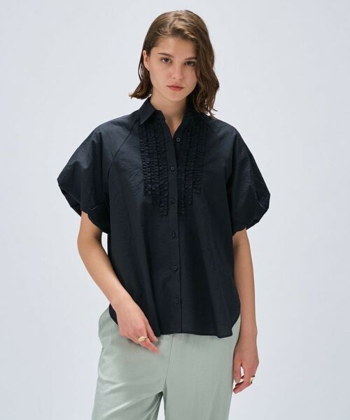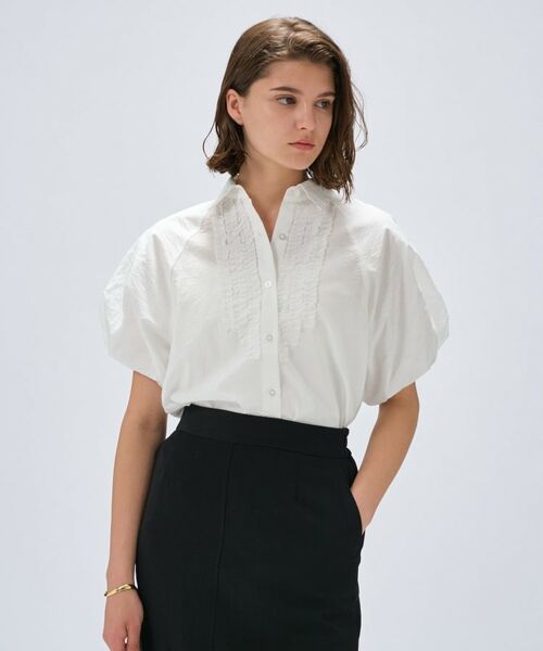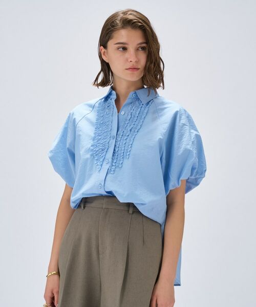 ・前面にあしらわれた繊細なフリルがフェミニンな印象を引き立て、かっちりしたシャツのルックに柔らかさを添えるデザイン。
