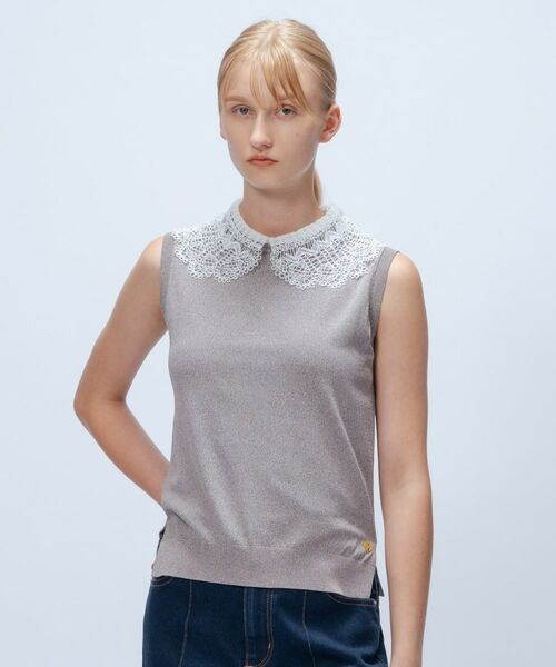 ・繊細なレース衿が目を惹くノースリーブトップス。