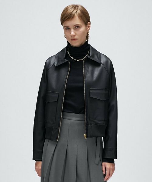 ・レザー特有のハード見えを抑えるため、衿はステンカラーに、大きめのポケットを付けて柔らかな印象に。