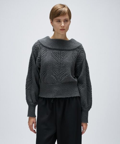 ・細やかな透かし編み柄が目を惹き、シンプルなスタイリングにも存在感をプラス。