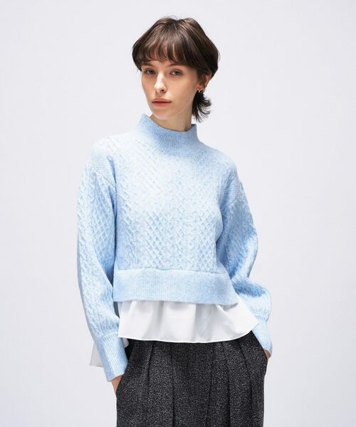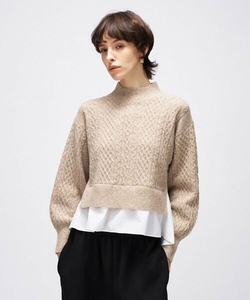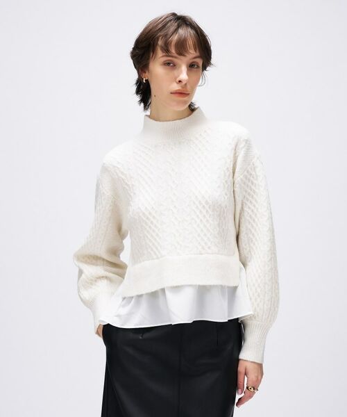 ・ニットと布帛をドッキングした異素材デザインで、1枚でレイヤード風の着こなしが楽しめるペプラムニット。