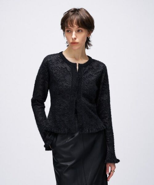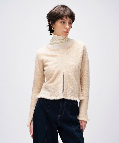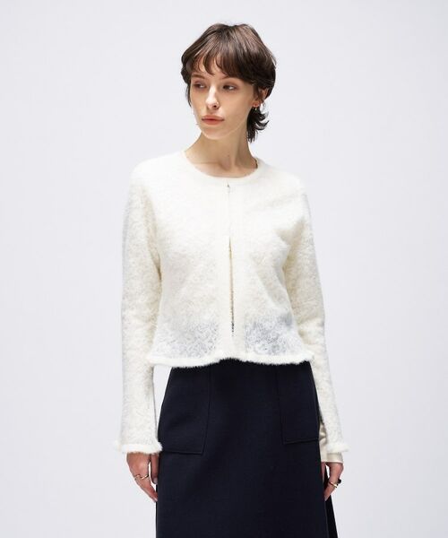 ・ふわふわの毛足感と繊細なフラワーレースが、大人フェミニンな印象を演出するフェザーヤーンカーディガン。