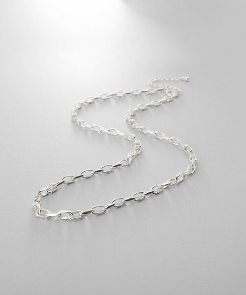 ニュアンスのあるチェーンが光を受けて絶妙な反射を生み出し、シンプルな装いでも存在感を引き立てます。