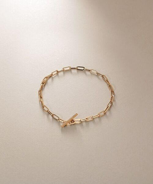 ダイヤモンドをあしらったバーを通す楕円パーツをチェーンのコマに見立てることで、無駄のないスタイリッシュなデザインに仕上げました。