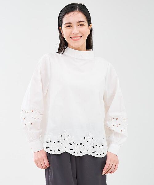 袖口と裾にはカットワークのレースをデザインし、透け感が軽やかで爽やかな印象です。