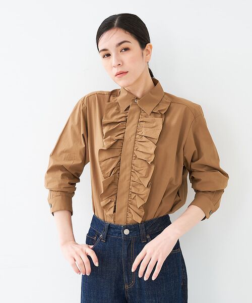 《POINT》旬の大きなフリルにシャツカラーがポイント。コットン100%ですが、しなやかさのある生地で女性らしい柔らかな印象に。背中にタックを入れゆったりとした着心地でありながら、正面から見た時にはコンパクトなシルエットに仕上げました。《COORDINATE》フロントを開けて羽織の様に着たり、デニムにインしてクラシカルな印象で着ても◎サックスブルー モデル:H162 B79 W59 H85 着用サイズ:Fブラウン モデル:H162 B79 W59 H85 着用サイズ:F