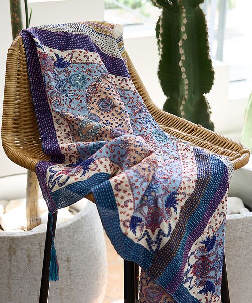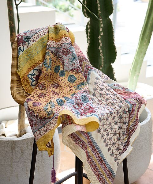 インドならではのプリント生地に、まるで絵を描くように繊細な手刺繍を施した大判ストール。