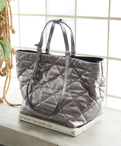 メタリックな輝きとキルティング加工が目を引く、スタイリッシュなバッグ。