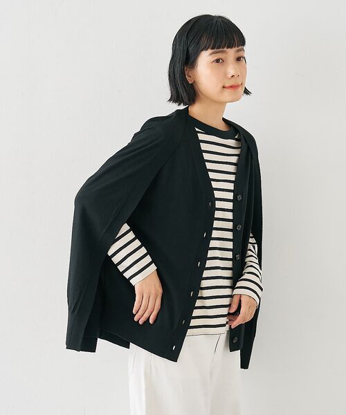 前身頃はベストを重ねたようなレイヤード風デザインで、ボタンを閉じればプルオーバーのように、すべて開ければ羽織りとしても着用可能。