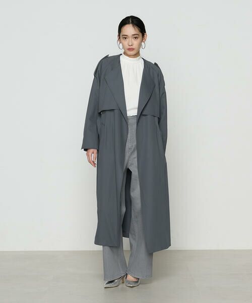 バサッと羽織ってきまる、着流し風がかっこいい、ノーカラー・釦レスのトレンチです。