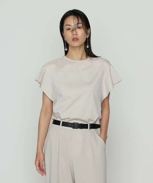 《デザイン》透け感のあるカラミときれいめなジャージーをドッキングしたブラウスのような感覚で着られる、プルオーバーです。一枚で様になるデザインなので暑くなるこれからの時期にぴったりの一着です。脇のパーツを作ることで、フレア袖が通常よりも中心から出るので着やせ効果が期待できます。後ろ開きのメタルボタンもポイントです。《素材》<ドライカラミ>ドビー織りでカラミ織りを再現した、透け感と清涼感のある素材に仕上げています。カラミ織りとは糸を絡ませることで生地に隙間を作る織り方です。目が粗いため、通気性が良く涼しく着ることができる最適な素材です。<クリアスムース>しなやかではりのあるスムースジャージーです。表面の毛羽を落としクリアな表面感にすることで上品なつやのあるきれいめなジャージー素材に仕上がっています。