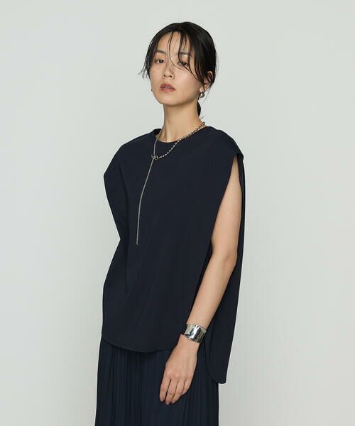 大胆なショルダータック、二の腕にも少しかかるくらいの程良いワイド感がモードです。
