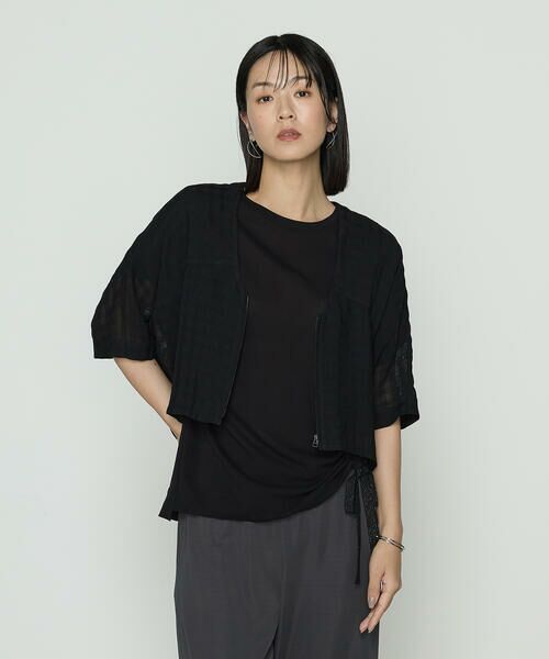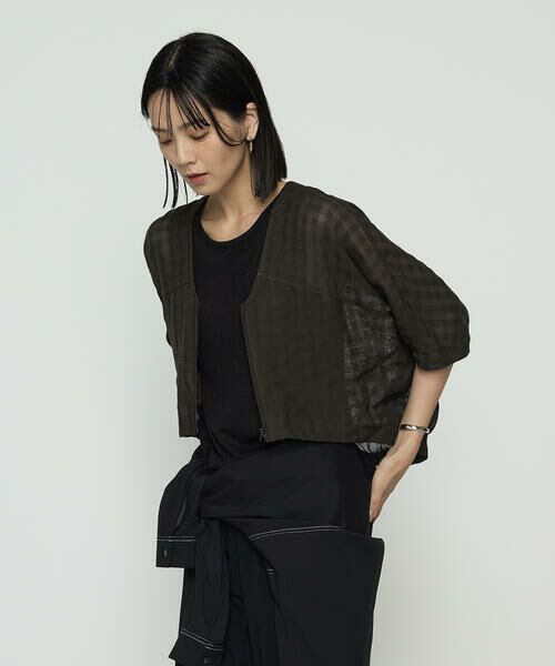 変形ドルマンスリーブと切り替え利用で柄を崩した遊び心溢れるカラミ織りブルゾンです。