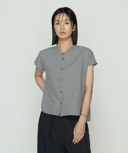 《デザイン》首元のボウタイが華やかな印象のギンガムチェックブラウスです。共地のボウタイは取り外し可能でシンプルなバンドカラーシャツとしても着られます。夏の暑い季節にボウタイがあることできちんと感も出せ、ジャケットを羽織ることでお仕事着にもおすすめです。 《素材》綿混のシアーサッカーギンガム素材です。特殊技術による非常に小さい通気孔による涼しさと天然タッチで非常に軽いのが特長です。撥水、2WAYストレッチ、防シワ、ウォッシャブルを備えた機能性素材は夏に最適です。《セットアップ》同素材のスカート(商品番号:34-38FM03-205)とセットでコーディネートして着用して頂くのもおすすめです。※在庫がない場合もございますので、予めご了承くださいませ。