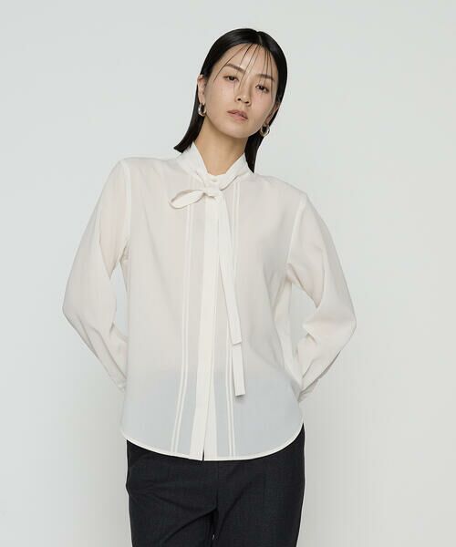 《デザイン》タキシードシャツのような印象のマニッシュなコムサらしいシャツです。一枚でももちろん、ジャケットのインナーとしてもスタイリングのアクセントになる一着です。バンドカラーから続いた細めのタイは、ゆるく一巻きして垂らしたり、リボン結びにしたり、そのまま垂らしてモードにとバリエーションを楽しめる一着です。また、二段になっているバンドカラーの上段を折り返すと少し女性らしい襟元になります。細めのピンタックやカフスの小さめのボタン、後ろ中心の2タック等、エレガントなディテールも兼ね備えています。《素材》絶妙な膨らみがありつつ、程良いハリがあるボイル素材です。微起毛感のある滑らかなタッチと繊細な表面感は合織でありながら梳毛のような質感が特長です。