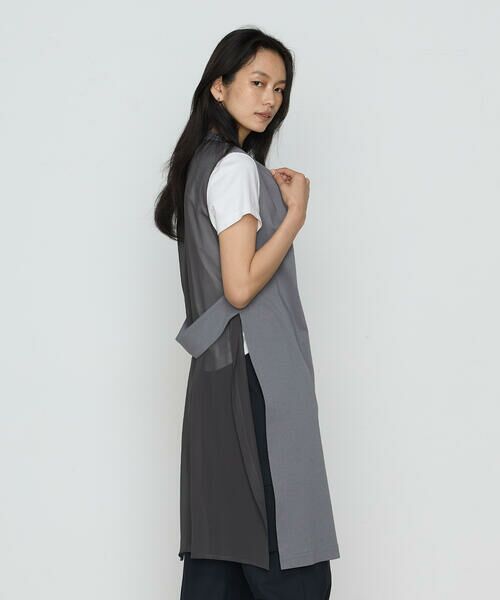 《デザイン》毎年好評のジレは、今年はより涼しくVネックにしインナーとのレイヤードを楽しめる一着です。後ろ身頃をシフォンにし、シアー感のある涼し気な印象です。共地のベルトもアクセントになっています。脇は縫い合わせではなく、深いスリットの様に開いているため抜け感もあります。Tシャツ等カジュアルになりがちなこれからの季節のコーディネートに一着羽織るだけで様になる便利なアイテムです。《素材》希少価値の高い、繊維の長さが長い超長綿を用い、毛羽を極限まで抑え強く光沢のある、保湿性・放湿性のバランスが取れた糸を使用しています。綿糸にポリエステルをはり合わせ、スパイラル構造に交編したことでストレッチ性に優れ、しわになりにくく反発性とドレープ性があります。肌離れが良く、乾きやすく、清涼感のある素材です。