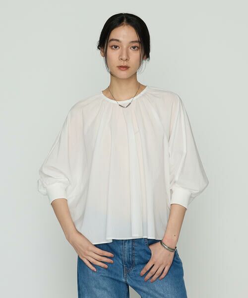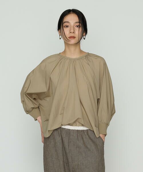 《デザイン》袖、身頃が一体のシルエットのギャザーブラウスです。生地をスポーティーなペーパータフタにすることで、程よくカジュアルダウンさせています。袖口がリブになっており、上げ下げしやすい仕様にしています。袖口をたくし上げることでパフスリーブのように膨らみシルエットの変化がつけられます。小粒なシルバーの金属釦がポイントです。合わせるボトムでカジュアルにも、エレガントにもなる万能アイテムです。《素材》径糸に細い糸のナイロンを使用しペーパーライクな風合いはそのままに、ワッシャー加工により軽やかでナチュラルな表情に仕上げています。肌離れが良く、さらっとした快適な着心地です。しわになりにくく、ご家庭で手洗いできるイージーケア素材です。