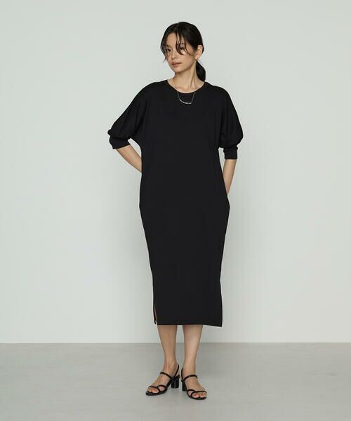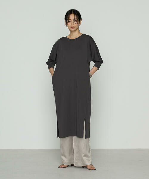 《デザイン》ドルマン袖のシンプルで大人のカットソーワンピースです。ウエストにくびれが出て、裾に向かってやや細くなるラインです。すっきり見えするシルエットにしています。背あて部分に同系色の光沢感のあるロゴ刺繍がポイントです。脇に便利なポケットも付いています。裾のスリットは足を美しく見せてくれる効果が期待できます。スニーカー合わせでスポーティーに、サンダル合わせできれいめなスタイリングにもなります。ワンピース一枚でシンプルな着こなしはもちろん、パンツ合わせもおすすめです。《素材》コンパクトベアフライス64/2のサイロコンパクトの微強撚糸を使用することで、毛羽が少なく綺麗な表情で清涼感あるジャージー素材です。バイオ加工を施すことで、クリアーな表情としなやかな風合いを出しています。ハイゲージで編むことで、目を詰め透け感を抑えています。