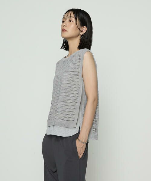 脇を後ろ身頃から編み続きの総針ベルトで繋いでいるので、見た目も軽やかでインするアイテを選びません。
