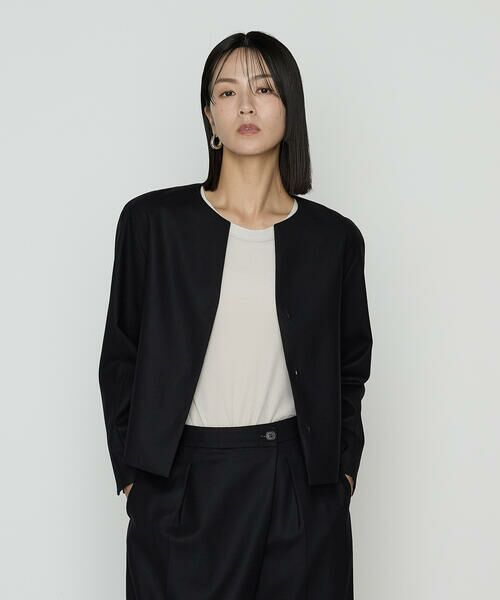 シンプルで洗練されたデザインのノーカラージャケットです。