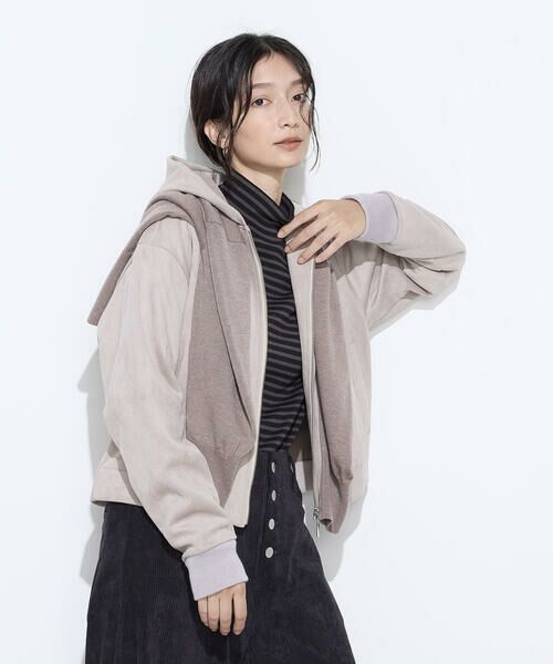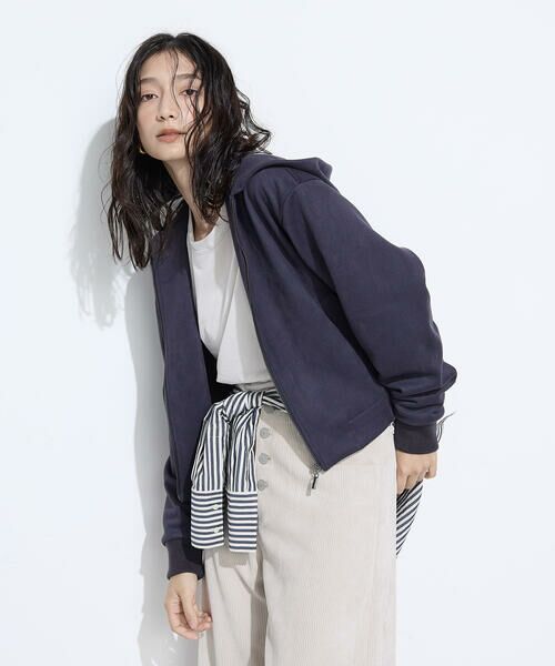 クロップド丈のパーカブルゾンで、ぷるんとハリ感のあるダンボール素材はストレッチ性があり、快適な着心地です。