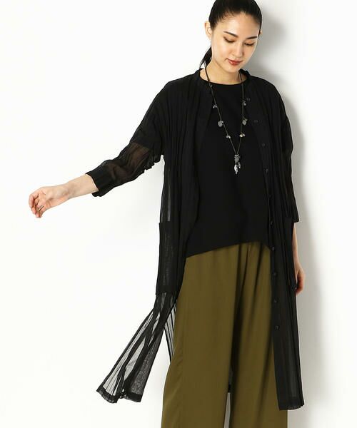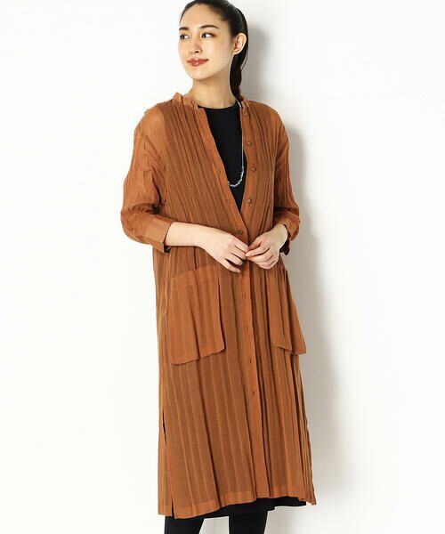《デザイン》一度プリーツをかけたあと、そのプリーツをつぶすようにもう一度プリーツ加工を入れたロングシャツです。ウエストより少し上でプリーツが消えるようにしたことで、視線が上に集まりスタイルアップ効果が期待できます。 《素材》コットンライクなオーガンジー素材です。肌ざわりはシャリっとしてべたつかず、洗ってもすぐ乾きます。軽さもあり、シワになりにくい素材です。