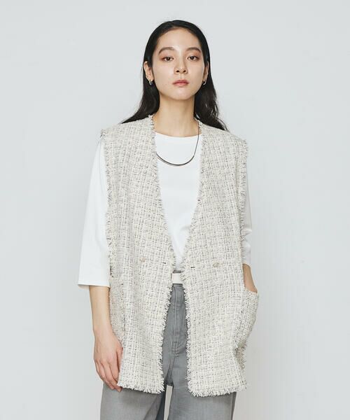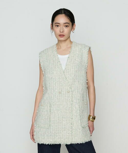 ロング&リーンシルエットが凛とした雰囲気のツイードジレです。